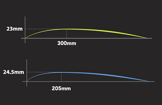 Drag-flicking & 3D skills have filtered down very quickly from the pro’s & have become a secret weapon across the game. The ULB will approximately reach its peak at 200mm from the head of the stick with the max bow being 24 - 24.75mm. Shorter distance to express the bow creates the ultimate slingshot effect & often will be combined with a concave shaft to make a specialised drag-flick stick. Again, the head will sit in front of the hands requiring a greater skill level to maintain the execution of your hits & slaps.