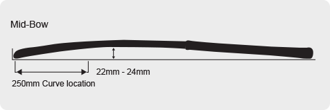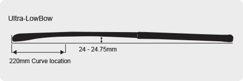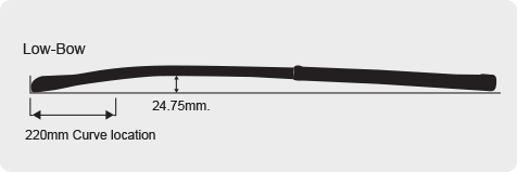 A modern day bow which will approximately reach it’s peak at 220mm from the head with a max bow of 24.75mm. The slightly shorter distance for the bow to be expressed creates a greater slingshot effect ideal for powerful drag-flicks. The head sits slightly in front of the hands making it easier to lift the ball, perform 3D skills & aerials without losing your hit or slapping ability. A greater degree of skill is required to execute the basic skills to the same level as with a midbow.